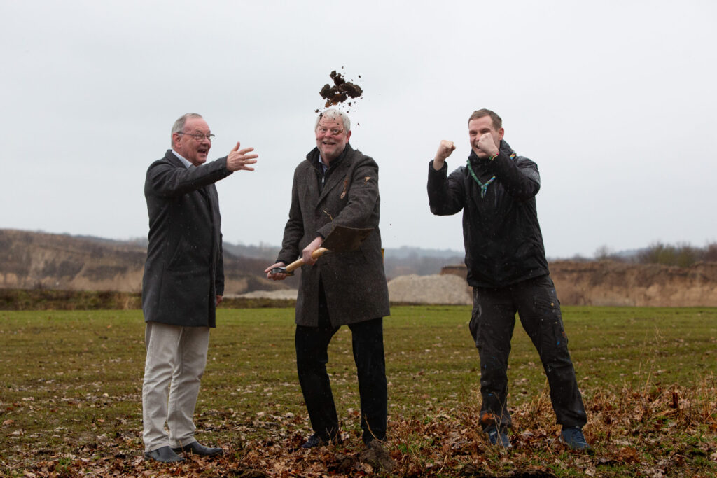 Til første spadestik ved Fremtidens Spejderhytte deltog forpersonerne fra Spejderne samt borgmestrene fra Roskilde og Høje-Taastrup.